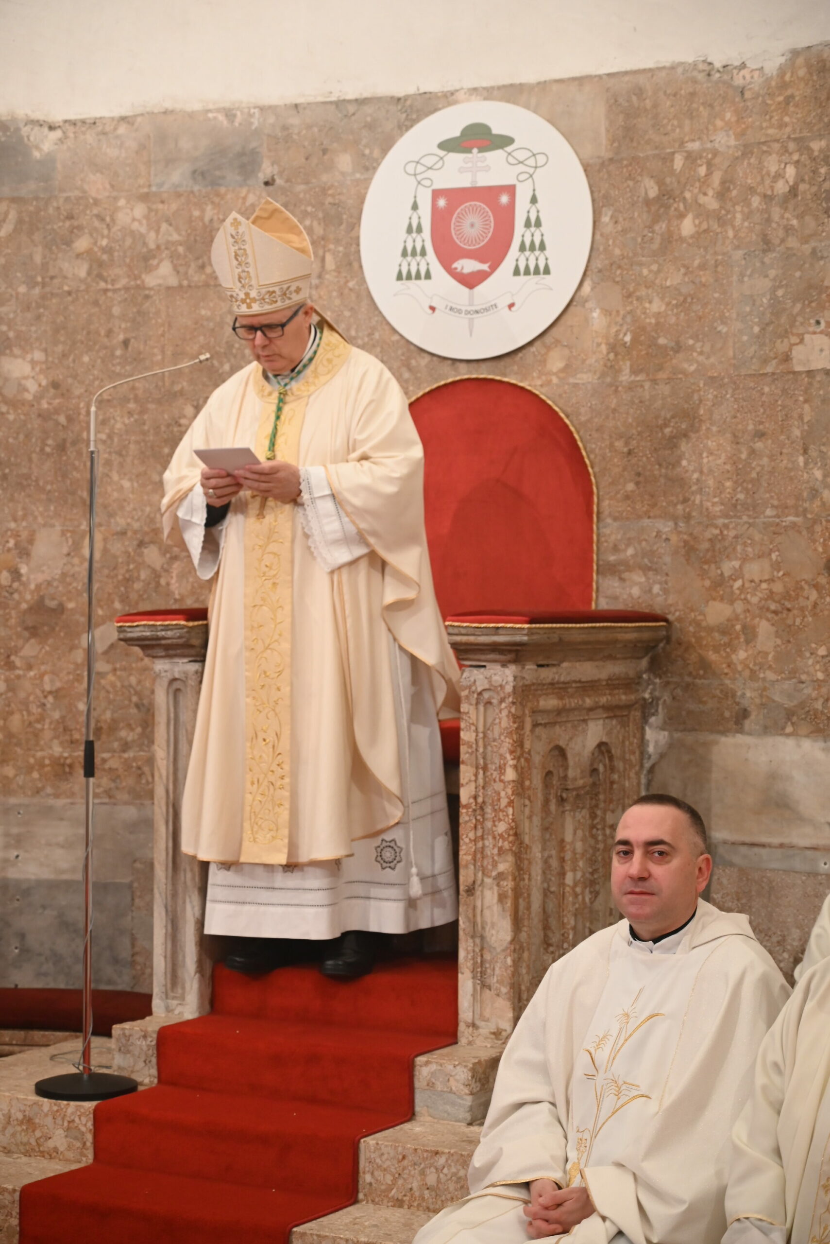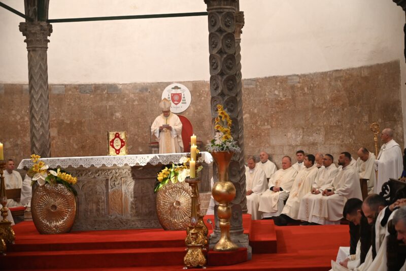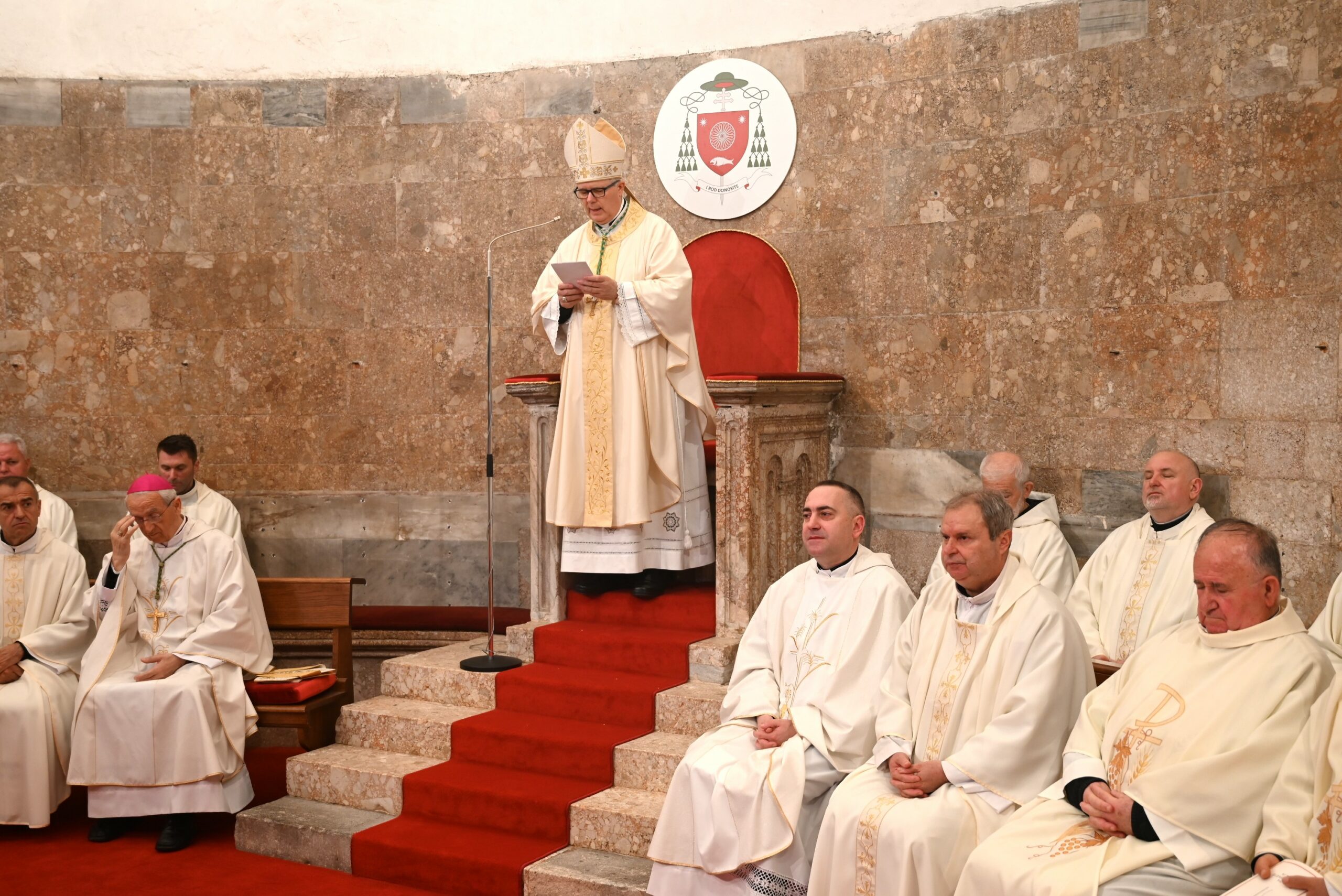 Danas, na Veliki četvrtak, u ovoj Misi posvete ulja, sabrani smo u našoj katedrali sv. Stošije, majci svih crkava naše Nadbiskupije, oko oltara Gospodnjega, kao jedan Božji narod i jedno prezbiterijsko tijelo mjesne Crkve okupljeno oko svoga biskupa, kako bismo slavili Misu posvete ulja – jedno od najsnažnijih očitovanja jedinstva Crkve, u kojemu se na vidljiv način očituje zajedništvo prezbitera s biskupom i zajedništvo čitavoga Božjeg naroda.
