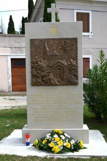 Na vrhu kamenog postolja je križ u sjećanje na jubilejsku 2025. godinu, a na vrhu spomen ploče je uklesan hrvatski grb u znak na 1100 godina Hrvatskog kraljevstva.