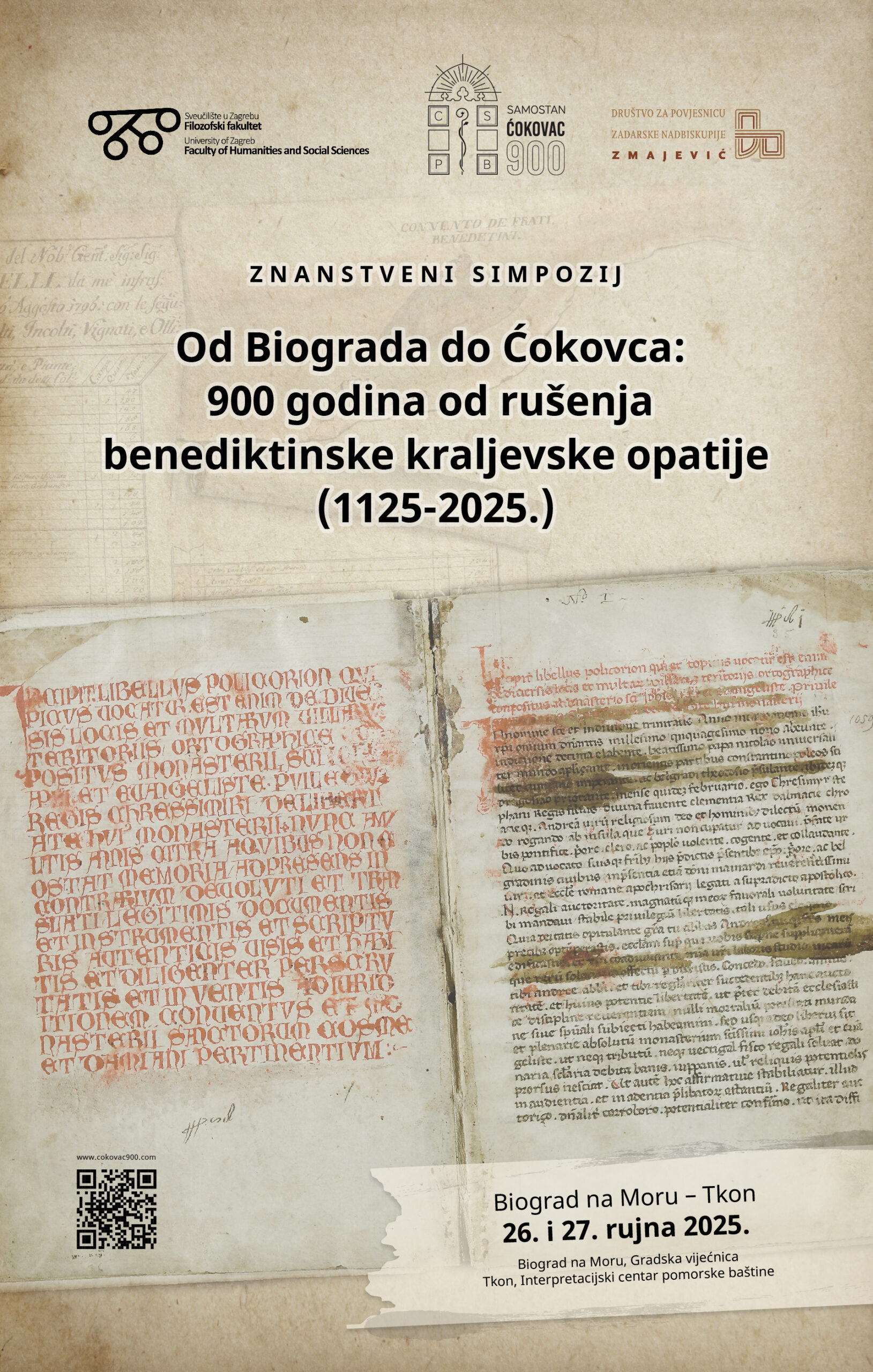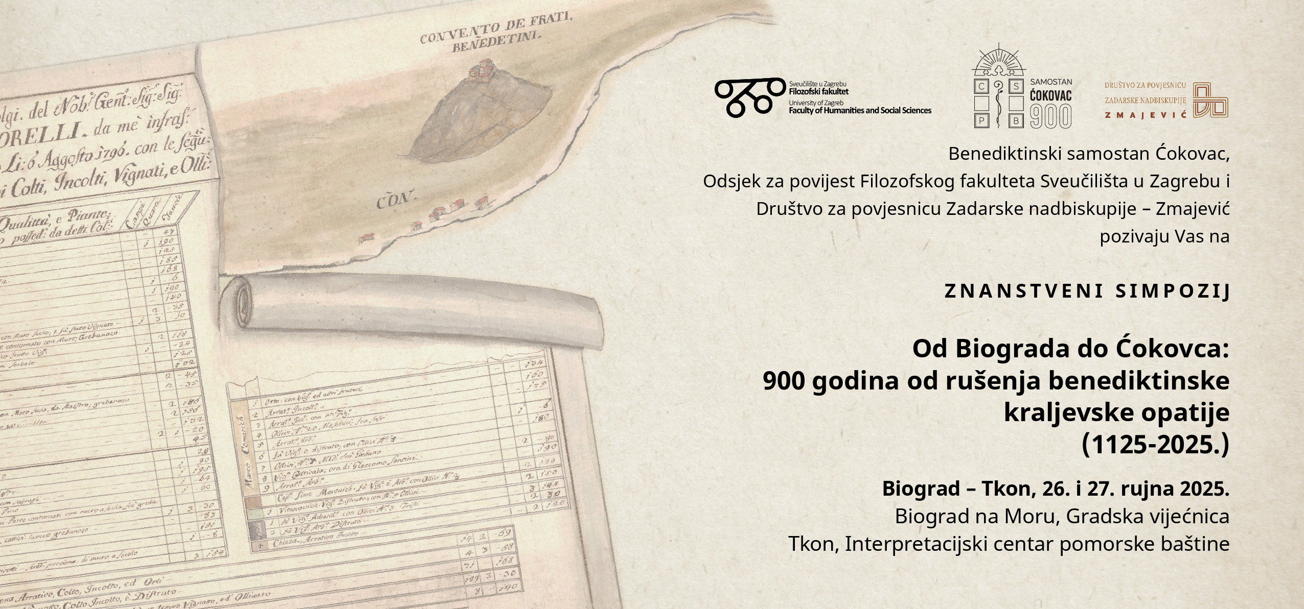 Okupljajući znanstvenike s područja povijesti, arheologije, povijesti umjetnosti te muzikologije, po prvi put će se interdisciplinarno pokušati osvijetliti rana povijest jedne od najznačajnijih srednjovjekovnih opatija u Hrvatskoj“, poručuju organizatori Simpozija, a to su: Benediktinski samostan sv. Kuzme i Damjana na Ćokovcu, Odsjek za povijest Filozofskog fakulteta Sveučilišta u Zagrebu i Društvo za povjesnicu Zadarske nadbiskupije ‘Zmajević’ u Zadru.