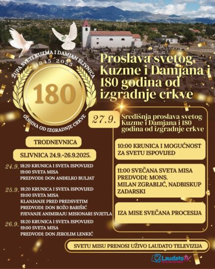 Glavna proslava povodom 180 godina izgradnje naše župne crkve će biti na blagdan naših zaštitnika sv. Kuzme i Damjana. Svečanu svetu Misu u zajedništvu svećenika i Božjeg puka u subotu, 27. rujna, s početkom u 11 sati, u župnoj crkvi sv. Kuzme i Damjana predvodi zadarski nadbiskup Milan Zgrablić, a proslavu će u izravnom Tv prijenosu prenositi Laudato televizija. Vas, dragi župljani i prijatelji, od srca pozivam da se uključite, da budemo zajedno, kao obitelj okupljena oko stola Gospodnjega i da ovu obljetnicu proslavimo dostojanstveno, s ponosom i vjerom.