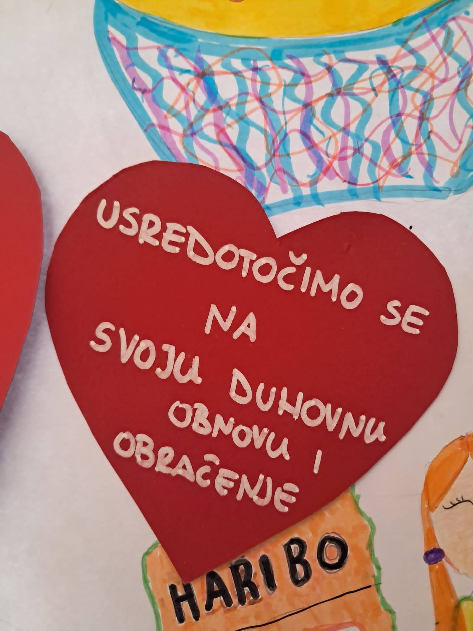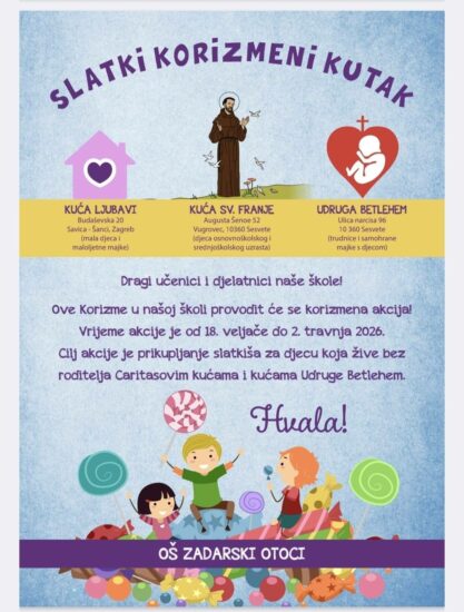 „Često kažemo da odricanje ima pravi smisao kada netko drugi od njega ima koristi. Akcija ‘Slatki korizmeni kutak’ je takav primjer. U hodniku škole se tijekom korizme postavlja prigodno označena kutija u koju učenici rado donose slatkiše kojih su se odrekli. U tom korizmenom kutku uredimo i prigodne duhovne poruke s poticajem na molitvu, zagrljaj prijatelja, posluh roditelja, darivanje osmijeha i pažnje, čine koji nas duhovno obnavljaju. Po završetku korizme prikupljeni darovi prosljeđuju se najpotrebnijima, najranjivijoj djeci; od djece djeci, od vršnjaka vršnjacima“, istaknula je Klarić.