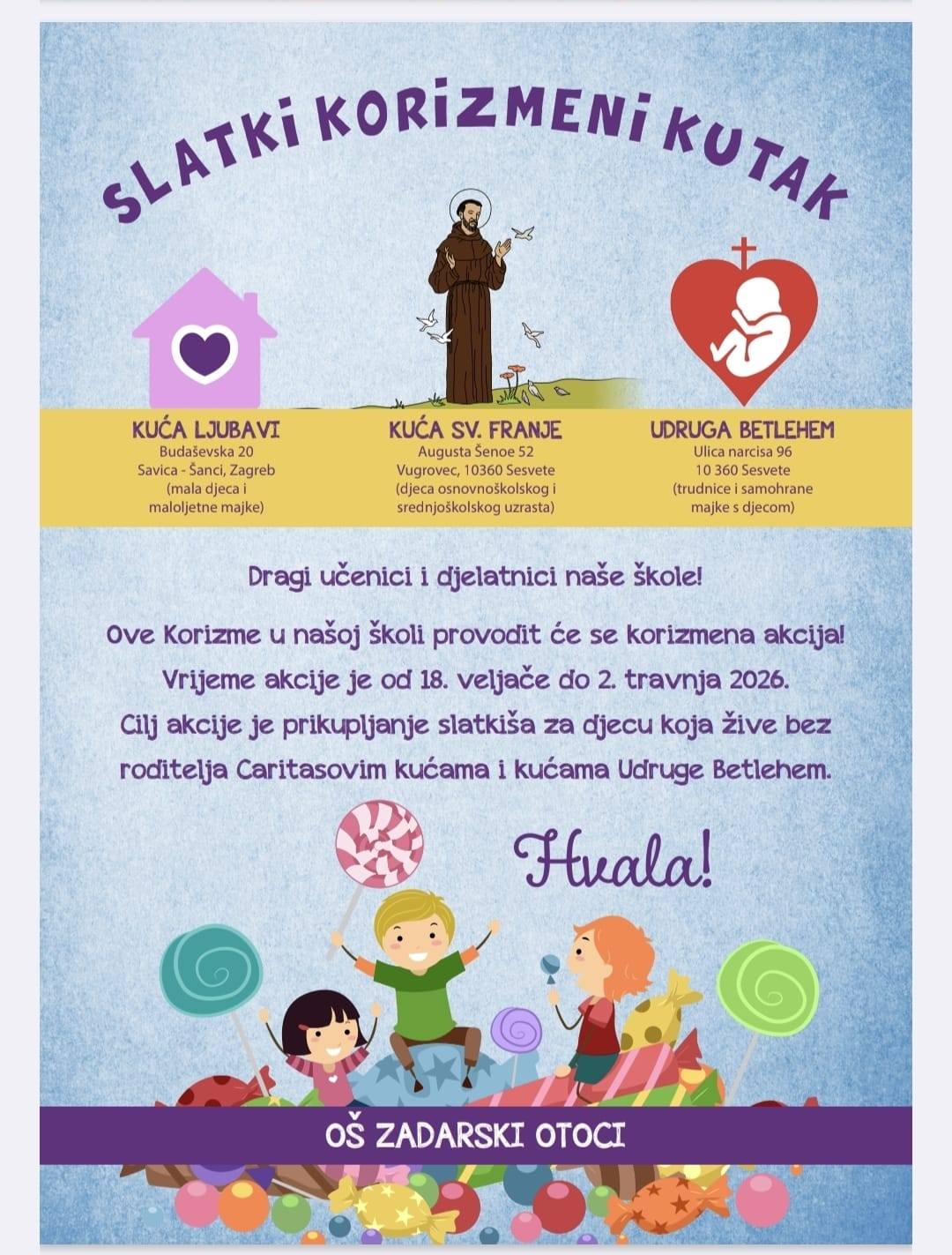 „Slatki korizmeni kutak“ je naziv korizmene akcije koja se na inicijativu vjeroučitelja Zadarske nadbiskupije, uz podršku i drugih učitelja, provodi tijekom korizme u osnovnim školama u Zadarskoj županiji, do 2. travnja.