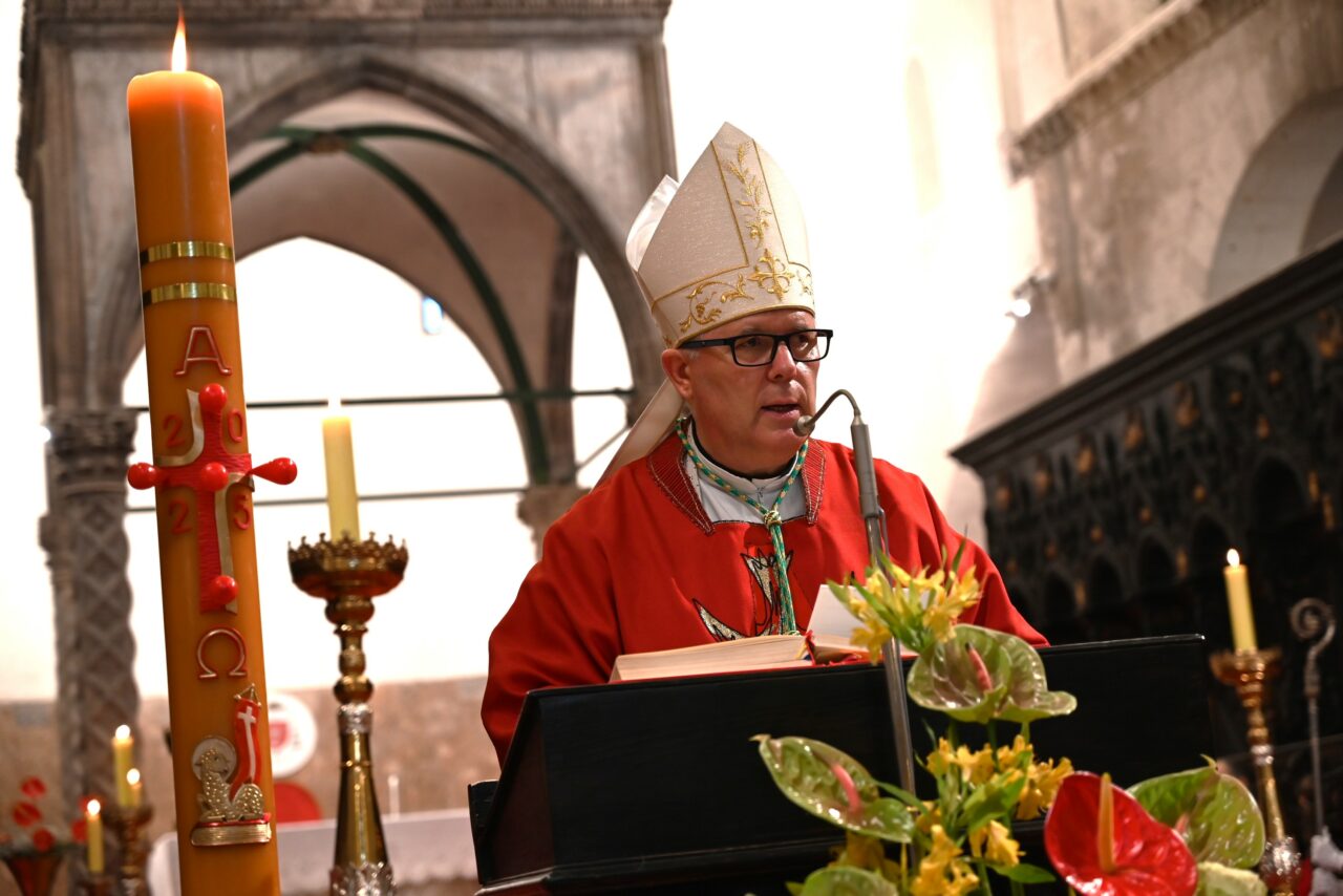 Okupili smo se večeras na ovom svetom mjestu, pod svodom naše katedrale sv. Stošije, da u zajedništvu različitih darova Duha Svetoga, u molitvi i budnosti dočekamo silazak Duha Svetoga. Naše bdjenje nije samo buđenje uspomene na ono što se jednom dogodilo nakon Isusova uskrsnuća na dan Pedesetnice u Jeruzalemu. Ovo bdjenje je poziv i izazov za Crkvu danas, za nas sada. Zašto? Jer živimo u vremenu u kojem su ljudi izgubili osjetljivost za Božju prisutnost, a Crkva je pozvana biti znak nade. Duh Sveti ne dolazi samo da bi nas utješio, donio radosti i mir u dušu, već da bi nas pokrenuo. Izazov Duha danas je da se ne zatvorimo u udobnost svoje zajednice, da ne postanemo isključivi, da ne budemo Crkva koja šuti pred nepravdom, koja se boji drugačijega ili se povlači i zatvara u prošlost i tradiciju, institucije i birokraciju. I danas Crkva treba Duhom ispunjene vjernike koji žive Evanđelje autentično i hrabro – u obiteljima, na radnim mjestima, u javnom prostoru. To je izazov Duha: da budemo živa zajednica koja ne samo da vjeruje, nego i djeluje i svjedoči.