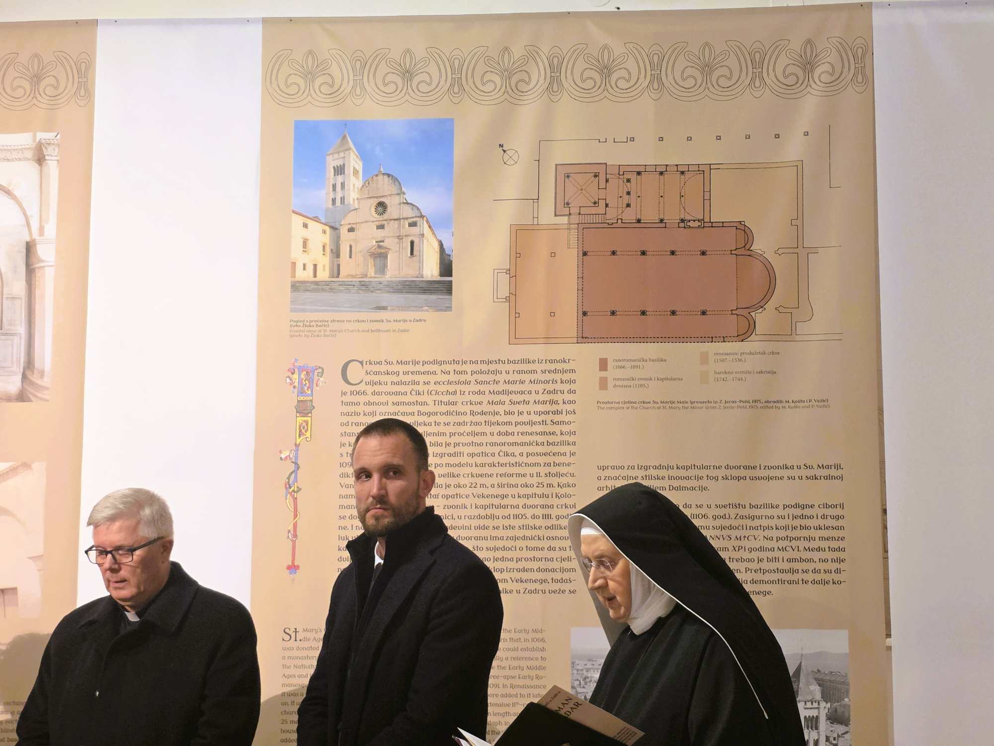 U tom činu isprepliću se duhovne težnje i svjetovni ciljevi – kralj Koloman je želio potvrditi svoj status hrvatskog kralja povezujući se sa samostanom benediktinki koje su bile i rodbinski povezane s hrvatskim kraljevima iz loze Trpimirovića. S druge strane, u tim turbulentnim vremenima, Samostan Sv. Marije želio je zadržati kraljevsku zaštitu koju je uživao od ranije. Kao rezultat toga ostaje impresivan spomenik ranoromaničke arhitekture, zvonik crkve Sv. Marije i kapitularna dvorana koji vremenski, stilski i prostorno čine jednu cjelinu“, rekla je opatica Čizmin. Poručila je da ta izložba „donosi dašak davnih vremena koja su bila puna nesigurnosti, nestabilnosti i opasnosti, a ostavila su nam vrijednu baštinu kojom se i danas s pravom ponosimo“.
