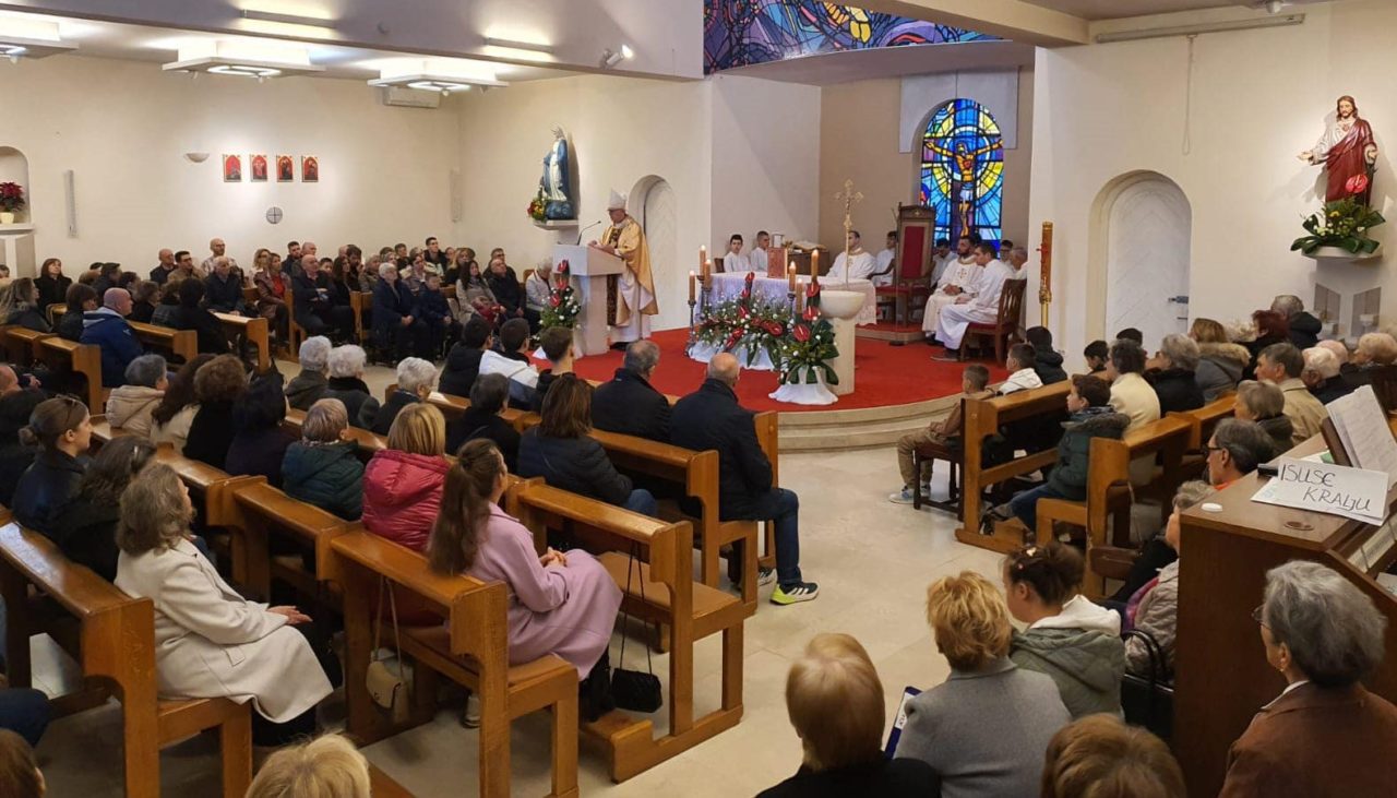 Misno slavlje u 10,30 sati u zajedništvu s braćom fra Bojanom, fra Andrijom i fra Pavlom, kao i u 12 sati, predvodio je nadbiskup mons. Milan Zgrablić. Na početku obaju slavlja pozdravio je nadbiskupa župnik fra Bojan. Nadbiskup je istaknuo svoju radost što može slaviti ovu svetkovinu Krista Kralja svega stvorenja s vjernicima ove župe te je zahvalio braći franjevcima i sestrama milosrdnicama na svemu što čine za ovu župnu zajednicu. U homiliji se osvrnuo na naviještenu Božju riječ podsjećajući nas kako svojom ljubavlju izgrađujemo kraljevstvo Božje već ovdje na zemlji. Na kraju Misnoga slavlja i župnik je zahvalio biskupu na dolasku u ovu župnu zajednicu podsjetivši na riječi pape Franje kako biskup mora biti ispred, u sredini i na kraju svoga stada. Upravo smo ovu milost i mi imali iskusiti ovim pastoralnim pohodom. Kao zahvalu i uspomenu za ove susrete nadbiskupu su djeca darovala svoje crteže, župljani cvijeće, a braća adventski vijenac koji je napravio naš fra Pavle.