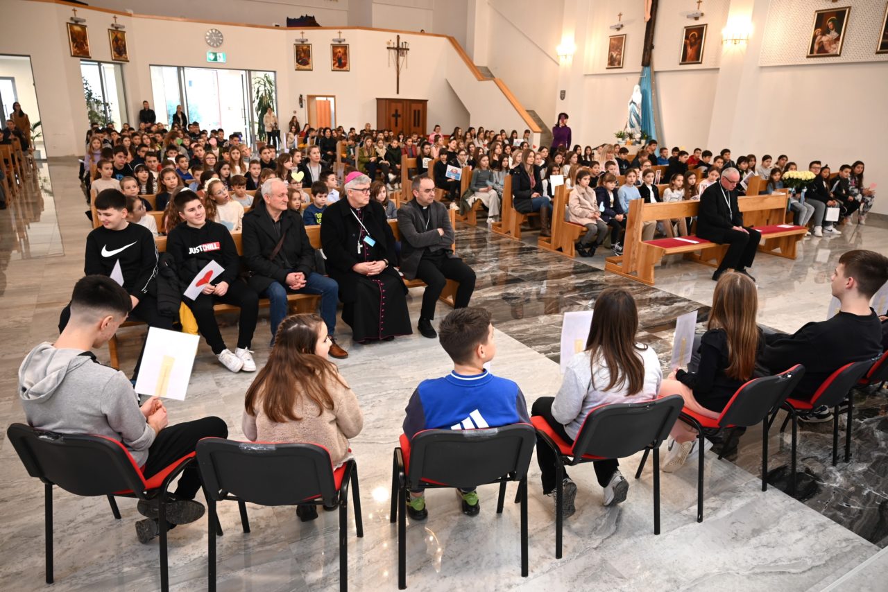 „Lijepo je vidjeti vas u tolikom broju u crkvi. Crkva je naša majka, koja nas voli i uvijek nas rado prima. Bog nas neizmjerno voli i svima nam želi veliko dobro. Toliko nas ljubi da ni svoga Sina nije poštedio, nego je umro za nas na križu. Toliko smo dragocjeni u Božjim očima“, rekao je mons. Zgrablić. Pohvalio je sabranost i pažnju te djece za vrijeme njihovog susreta. Poželio im je da napreduju u znanju i u školi; da slušaju učitelje, da se igraju, da im bude lijepo u školi, da se razvijaju u svojim tjelesnim i umnim sposobnostima, u svom srcu i duši.