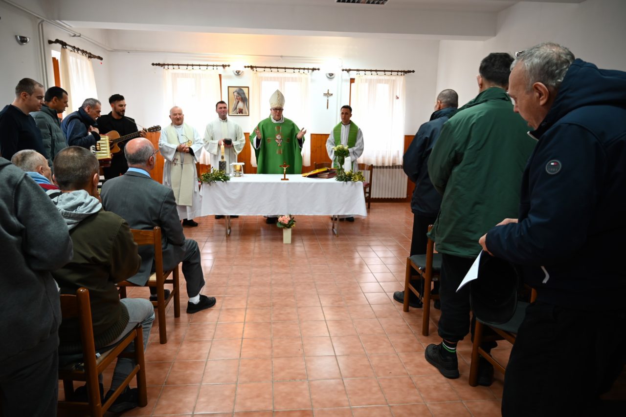 Susret je počeo misnim slavljem kojeg je nadbiskup Zgrablić predvodio u dvorani Doma u kojem su sudjelovali djelatnici i štićenici te ustanove u kojoj se nalazi 146 korisnika. O njima skrbi 73 djelatnika, a o još 80 korisnika u njihovim kućama svakodnevno skrbe mobilni i terapeutski timovi toga Doma pohodeći stare i nemoćne u njihovim domovina, pružajući im psiho-socijalnu pomoć. Na taj način unaprjeđuje se kvaliteta njege u kući, čime se prevenira i odgađa smještaj osoba u socijalne ustanove, u suradnji s lokalnom zajednicom.